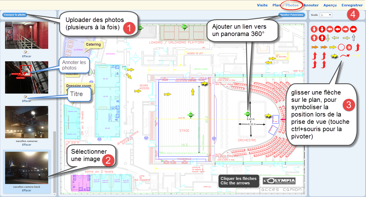 7 - sécuriser certains éléments avec le mot de passe que vous définissez. 8 - ajouter des photos dans le formulaire dans les sections: Accès camion(2photos) et parking tour Bus (2photos),accès artistes(2photos), armoires électriques(6photos),la Scène (2),le Son(2), la Lumière(2), les loges(4), le Catering(2), et bureau de prod(2) (soit 26 photos en tout) 9 - créer vous-même en ligne, votre visite virtuelle en associant des photos à une flèche sur votre plan. 10 - annoter (écrire ou dessiner) toutes les photos 11 - Proposer des photos 360° simples ou plan/photo 360° (nous contacter)