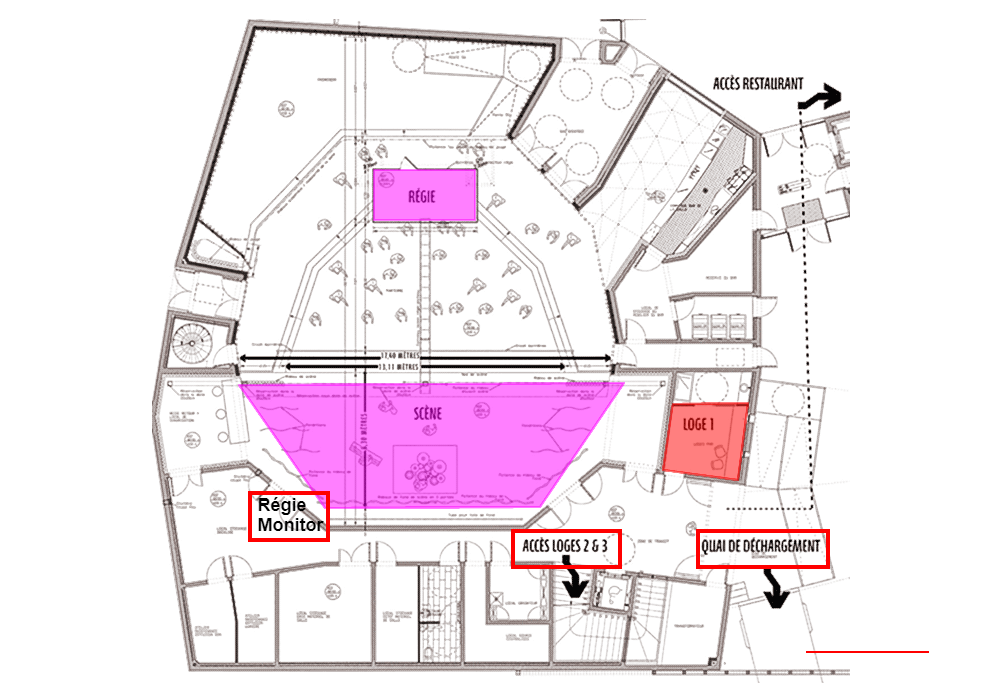 Le Plan::Grande Salle Plan de masse More plans Plan de masse Accès Tourbus Camion truck Vue globale de la salle More plans